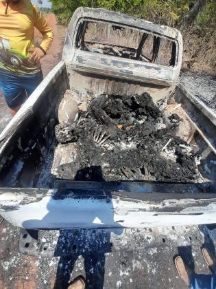 Um vídeo que circula nas redes sociais, mostra que os corpos na carroceira do veículo, que também foi destruído pelo fogo. Há suspeita de que o crime tenha ocorrido na noite da última quarta-feira (24).