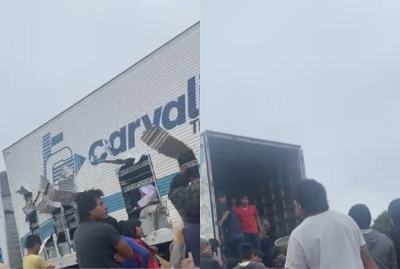 Nas imagens é possível ver as pessoas retirando a mercadoria pelos fundos do caminhão, enquanto outras rasgam parte da estrutura metálica que fica na lateral para pegar mais coisas.