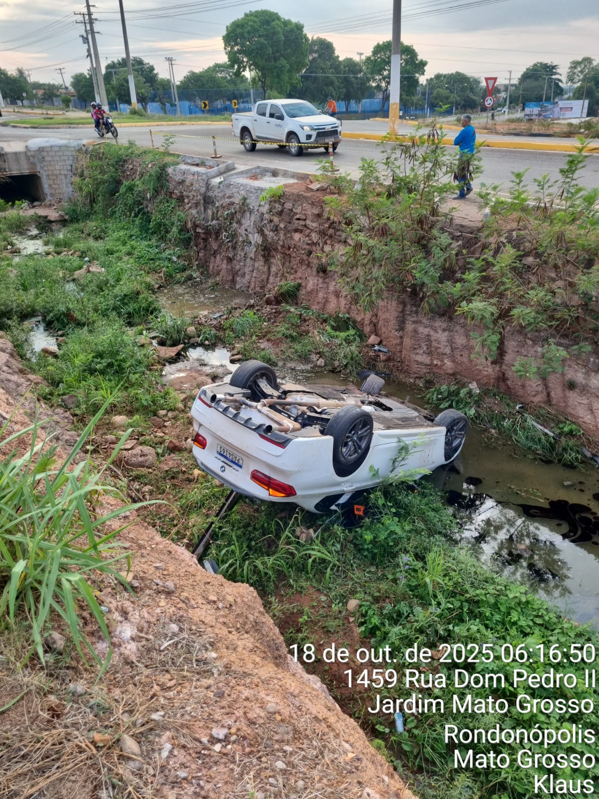 O motorista de uma BMW de cor branca, ao fazer a rotatória de acesso ao condomínio Terra nova, perdeu o controle da direção e capotou o veículo, que foi parar dentro da valeta da rede de esgoto as margens da avenida.