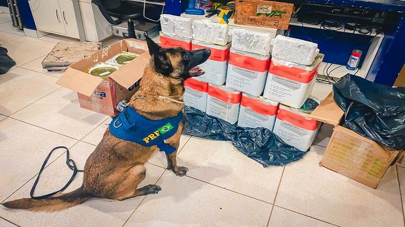Durante a vistoria no compartimento de bagagens, o cão de detecção de entorpecentes K9 Zion sinalizou a presença de ilícitos em seis caixas despachadas. No interior delas, foram encontradas latas de massa corrida que escondiam 47 tabletes de substância análoga a skunk, totalizando aproximadamente 59 kg. A pesagem oficial será realizada pela Politec, já que o entorpecente estava imerso no material.