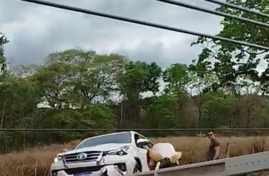 Um vídeo que circula nas redes sociais neste domingo (19) mostra uma caminhonete SW4 batida no acostamento e um poste caído no meio da pista, na Rodovia do Peixe, em Rondonópolis.
