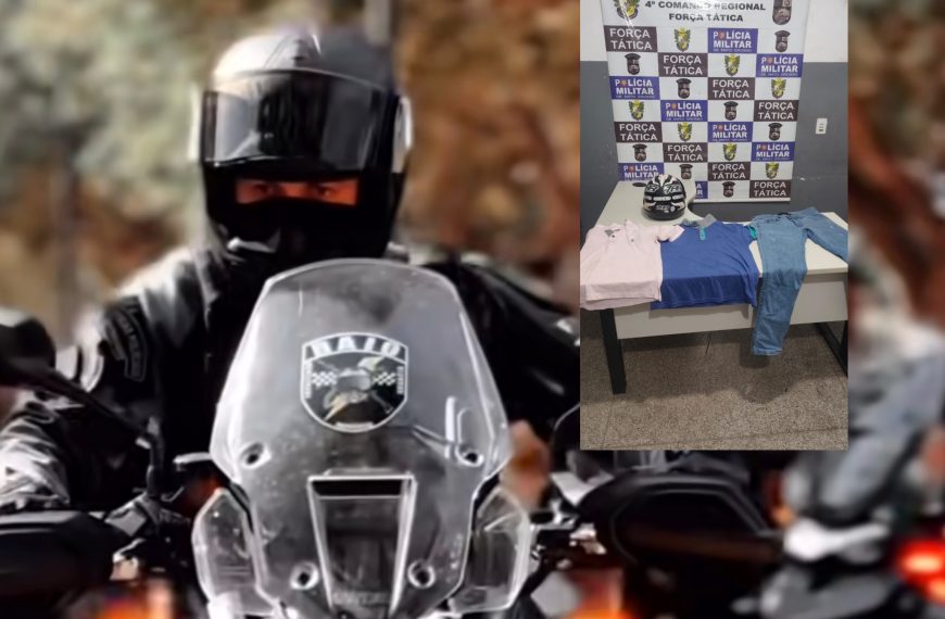 A equipe RAIO recebeu informações da Agência Local de Inteligência e seguiu até o endereço onde o suspeito se escondia. No imóvel, os policiais localizaram uma motocicleta Honda CG 125 Titan vermelha e um capacete preto com viseira escura e numeração “788”, itens que batem com os utilizados no roubo registrado na Drogaria Ultrapopular, ocorrido na noite de sábado (21), por volta das 23h20, na Avenida Goiânia.