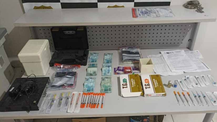 Foram apreendidos diversos materiais, como unidades de Enoxaparina, 29 seringas, um DVR, cartão de memória, estojo de arma com acessórios, além de ampolas de Benzilpenicilina e Drostanolona.